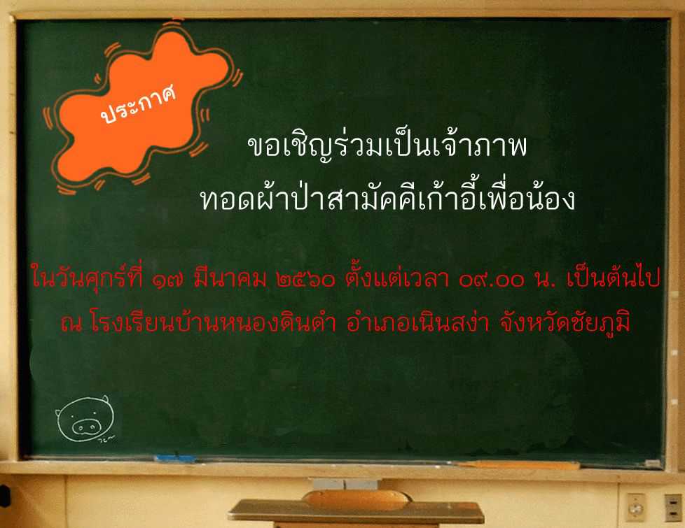 โรงเรียนบ้านหนองดินดำจึงขอบอกบุญมายังท่านได้ร่วมเป็นเจ้าภาพในการทอดผ้าป่าสามัคคีเก้าอี้เพื่อน้องในครั้งนี้ตามวันเวลา ดังกล่าว ขออำนาจคุณพระศรีรัตนตรัยและสิ่งศักดิ์สิทธิ์ทั้งหลายในสากลโลกโดยเฉพาะดวงวิญญาณอันศักดิ์สิทธิ์ของเจ้าพ่อพระยาแลที่ชาวชัยภูมิเคารพนับถือ จงดลบันดาลให้ท่านและครอบครัวประสบแต่ความสุข ความเจริญตลอดไป เทอญ